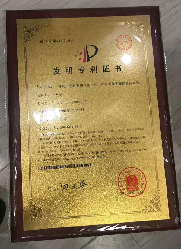 洗滌劑和車(chē)用尿素用戶的品質(zhì)保障,湖南富達(dá)日化頒發(fā)國(guó)家發(fā)明專利金色牌匾。