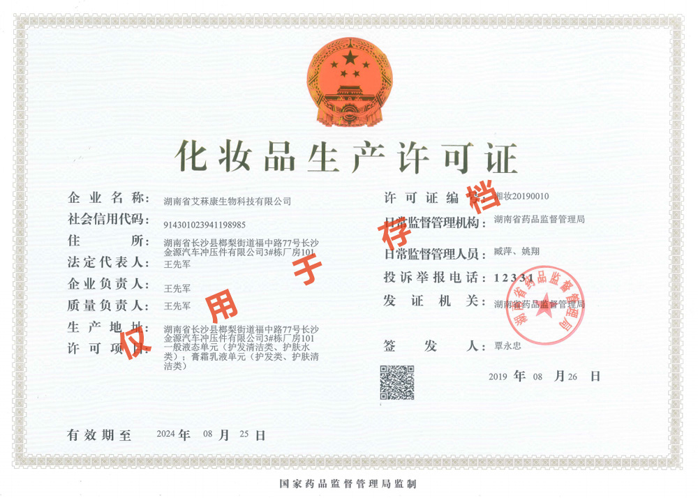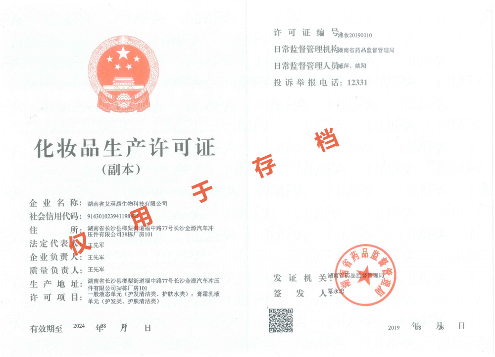 多項專利發明人王先軍 手機:150-7483-5702 手機:195-7316-0288經食藥監局領導專家們層層審核并一致通過,富達艾菻康公司正式獲得了化妝品生產許可證。消息傳來,公司全體員工群情激奮,熱烈歡呼。此次順利通過現場驗收并取得化妝品生產許可證,標志著公司已完全具備了生產和銷售一般液態單元(護發清潔類、護膚水類);膏霜乳液單元(護發類、護膚清潔類)的資質,這將成為公司進軍化妝品行業的新起點。