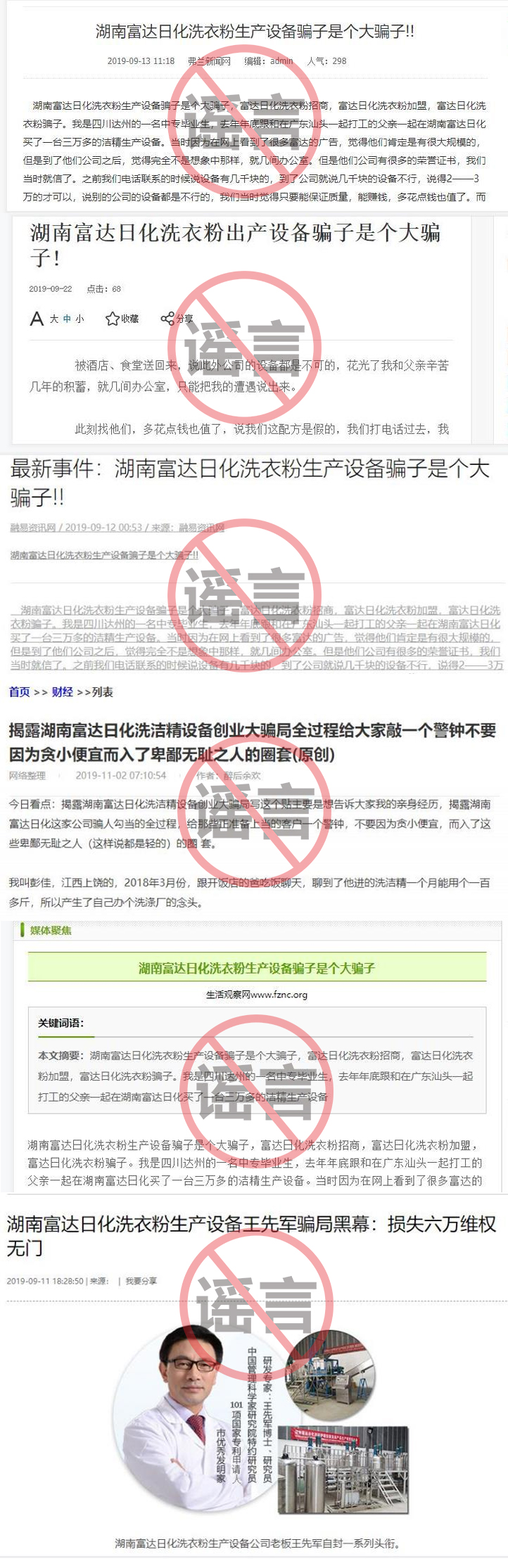 不難發現,這些文章的主人公不一樣,但發文章的時間卻出奇的一致,都集中在2019年9月份左右。這是為什么呢?這些同行之所以惡意誹謗富達日化,是因為湖南富達日化發起的中國創業者防騙鋤騙互助沙龍微信群公開揭露了北京武漢等地的偽劣洗潔精設備和偽劣洗衣液設備及偽劣車用尿素設備,達到打擊報復惡意誹謗富達日化的目的。眾所周知,富達日化成立30多年,創始人王先軍是一百多項專利的發明人,他的所有產品都是被國家所認可。而當富達日化的創始人公開打假、公開揭露北京武漢同行偽劣洗潔精設備偽劣洗衣液設備偽劣車用尿素設備內幕的時候,騙局制造者們狗急跳墻,試圖用捏造事實惡意攻擊湖南富達日化的行為阻止中國鋤騙防騙互助沙龍的打假行為,湖南富達日化的回答是:絕對辦不到!