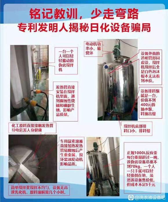 多項專利發明人王先軍 手機:150-7483-5702 手機:195-7316-0288洗潔精洗衣液車用尿素設備銷售者五花八門,許多不法商販炮制萬元投資可辦廠的謊言,推銷低價偽劣洗潔精設備,洗衣液設備,車用尿素設備,無數初創業者上當受騙血本無歸,為了讓創業者少走彎路,受良心驅使,公開揭示日化設備騙局,以此讓大家少走彎路。