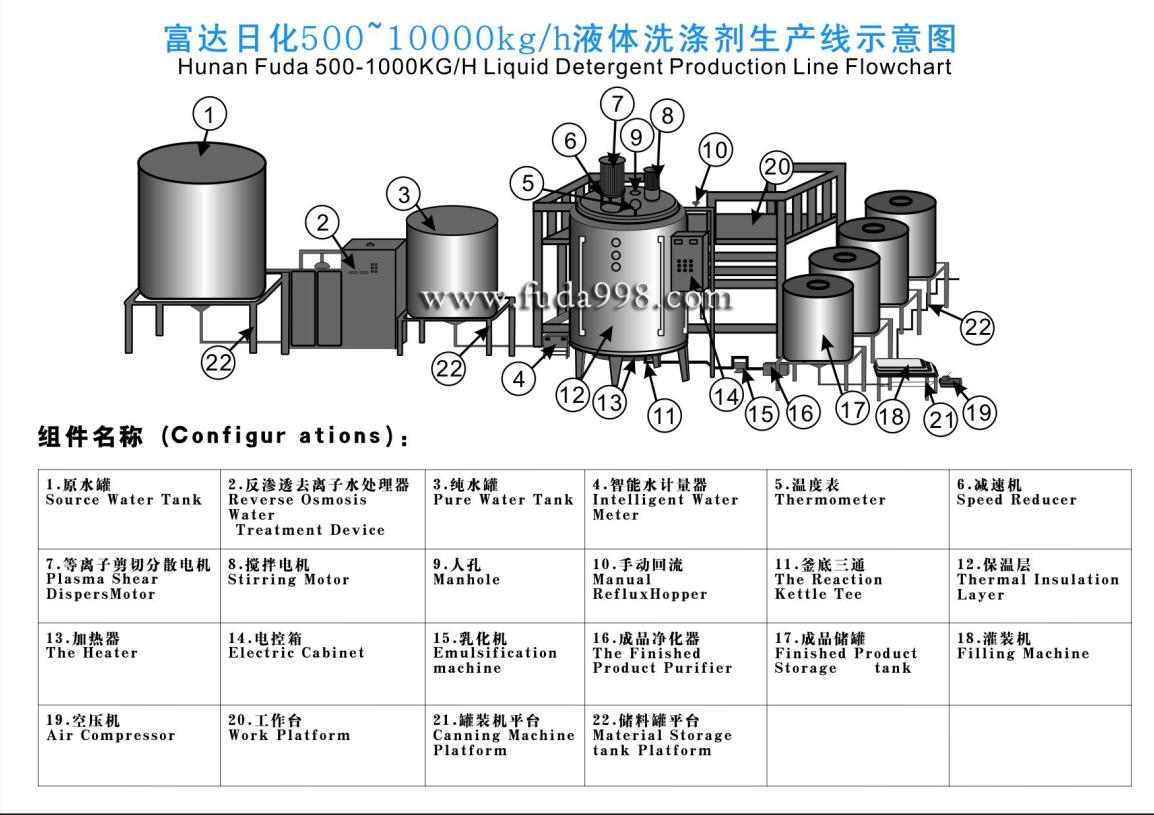 以上就是完整的整條洗衣液生產線,富達日化76項發明人提醒您:由于液體洗滌劑產品都是80%-90%的水加10%-20%的原料,因此對水質的要求高。通過反滲透水處理后的水可以去除水質中的雜質、礦物質、重金屬、細菌等,防止因為水質使洗衣液分層、變質、變臭等現象。