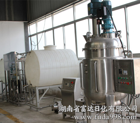 3)富達(dá)日化洗潔精設(shè)備特點(diǎn):傳統(tǒng)洗潔精生產(chǎn)設(shè)備,就是安裝一個(gè)攪拌機(jī)裝置對(duì)原料攪拌,因攪拌不均勻產(chǎn)品乳化不夠好,導(dǎo)致成品上層濃度太小。故只能投入更多的原料,即增加了成本。因乳化不夠好,一段時(shí)間后產(chǎn)品容易分層,容易變質(zhì)。富達(dá)日化洗潔精生產(chǎn)設(shè)備,在機(jī)器上部安裝高速剪切機(jī)和攪拌機(jī),兩臺(tái)裝置高速旋轉(zhuǎn)(3000轉(zhuǎn)/分),讓原料能夠充分的攪拌和乳化,達(dá)到濃度統(tǒng)一,產(chǎn)品不容易分層,節(jié)省了成本的同時(shí)也保證了質(zhì)量;下部安裝的是乳化裝置,把難以溶解的原料循環(huán)徹底乳化,使保質(zhì)期延長;