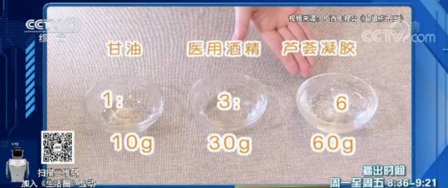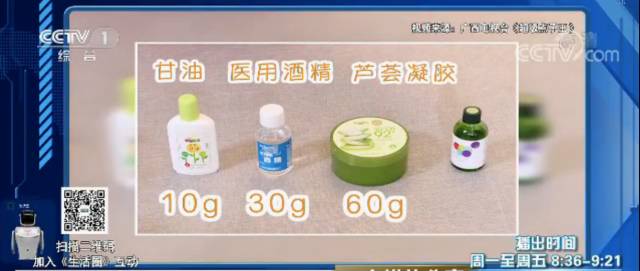 小貼士:95%的醫用酒精和甘油及蘆薈凝膠混合在一起,會稀釋酒精的濃度,再用來洗手就不會傷皮膚了。